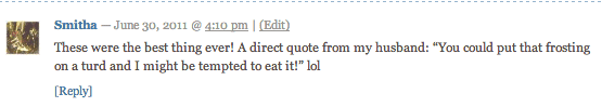 Bloggers love feedback in the form of comments – I love hearing from people who try the recipes I develop and post. It's really neat to hear all about it and always great to get constructive criticism. I wanted to share with you the best ever pinterest caption I have got when someone pinned one of my recipes but I can't seem to find it so I dug up this comment I received last year on peanut butter cup cupcakes I posted. I chuckled out loud and seeing it again makes me laugh even harder.