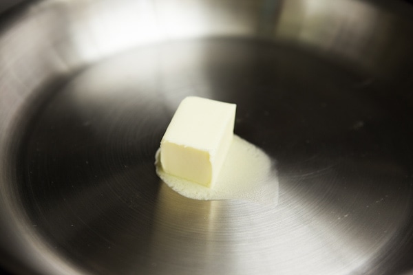 Next, melt butter in a stainless steel skillet or pan. I don't use nonstick because I need to use my whisk, I guess if you have a silicon whisk you could use a nonstick pan.