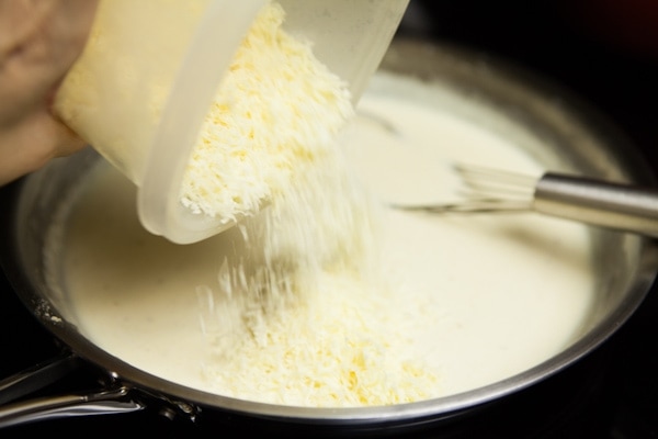 Slowly whisk in the heavy cream and milk and cook for a few minutes. Add salt, pepper and white pepper and then add the cheese until it melts. Constantly whisk the cheese mixture.
