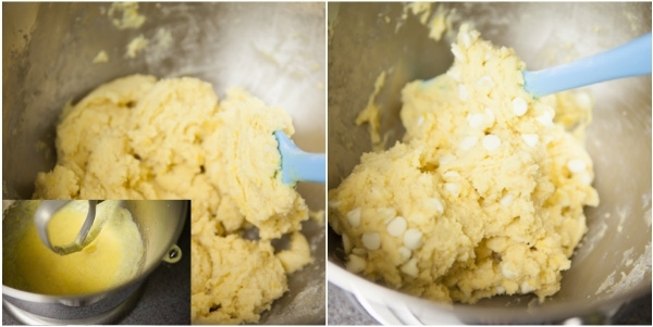 Bottom corner: add the vanilla, Meyer lemon zest and Meyer lemon juice. Mix thoroughly and then add the dry ingredients in batches. Then add the white chocolate!