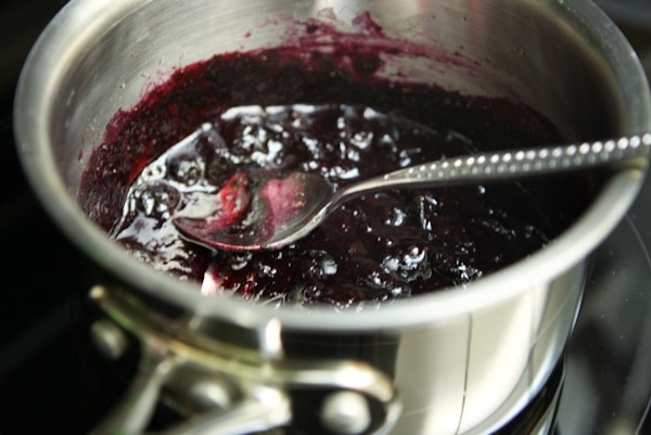 - Add 1 cup blueberries and 1 teaspoon sugar to a small saucepan at medium heat. Allow to simmer and cook, mash the berries with the back of a spoon until all of the berries are broken down. Stir frequently and cook until mixture is thickened and reduced to about ¼ cup, about 6 minutes. Set aside and allow to cool to room temperature, about 15 to 20 minutes.