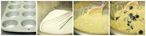- Using rubber spatula or a wooden spoon, fold in egg mixture and remaining cup blueberries into flour mixture until just moistened. (Do not overmix. The batter will be lumpy and that's fine.)