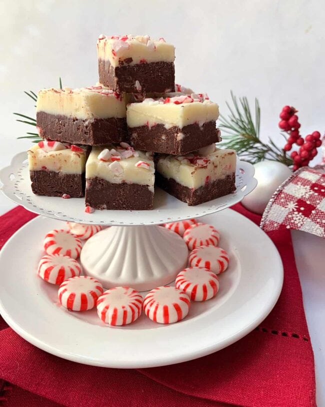 Layered Chocolate Peppermint Fudge makes such a pretty presentation with dark chocolate and white chocolate layers filled with colorful peppermint candies. This easy five-ingredient recipe is easy-to-make and perfect for the holidays.