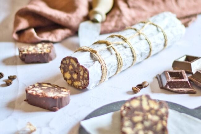 An easy and delicious gift for any plant-based people in your life! This chocolate salami is super simple to make and you can customize it to suit your giftee.