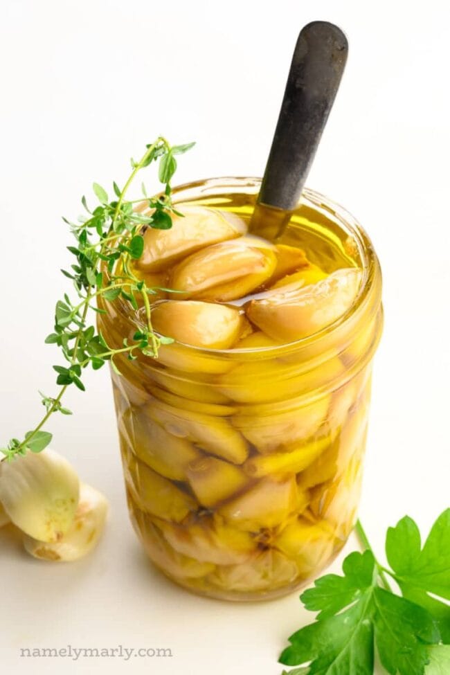 Looking for a savory gift for the foodies in your life? This garlic confit inspires oohs and ahhhs from your favorite people! Make this easy garlic confit recipe and transform your everyday meals with the delicious, subtle, savory taste of garlic oil, and it’s made with only two ingredients.