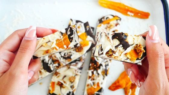 Chocolate bark filled with nuts and dry fruits is one of the easiest treats you can make. Like this tropical mango and granola chocolate bark. Plus, it makes a great homemade edible gift!
