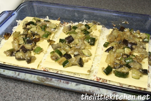 - Spread evenly 1/3 cup of the roasted vegetables on top of each of the lasagna noodles you just laid down.