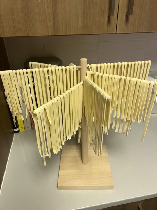 • After the first time making it, we realized that forming it into nests wasn’t a good idea. They dried before we unraveled it and they were a clumpy mess. Now we have a pasta rack (pictured) and it works perfectly! We even used clothes hangers before we had the pasta rack and those worked fine too.