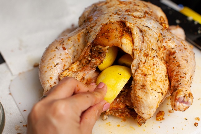 Add quartered lemons to the inside of the chicken.