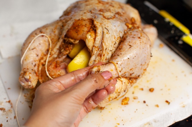 Tie the legs together with kitchen twine.