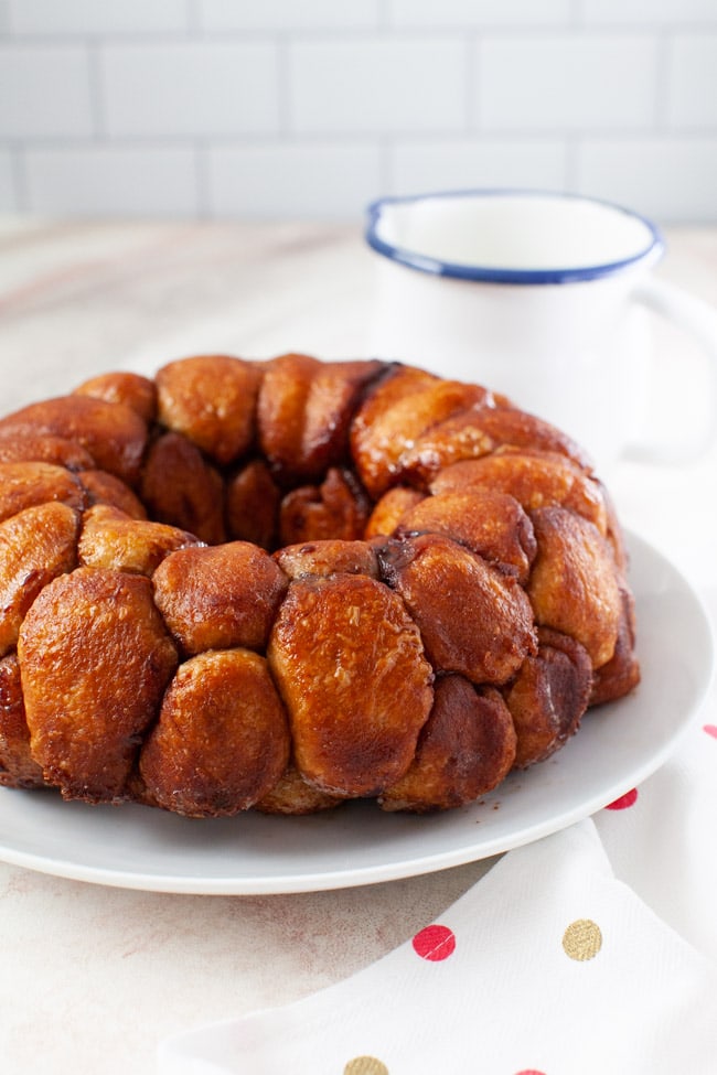 Once baked, monkey bread is inverted onto a plate or cake stand and is served pull apart style. Everyone tears a little piece off themselves. This is similar to how monkeys eat their food, which is where the name monkey bread comes from.