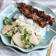 Korean Red Pepper Paste Beef Skewers with an Asian Pear Cabbage Slaw