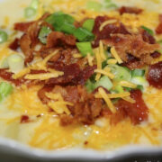 - Season with salt and pepper before serving. Serve in bowls and garnish each bowl with cheese, bacon (optional) and green onions.